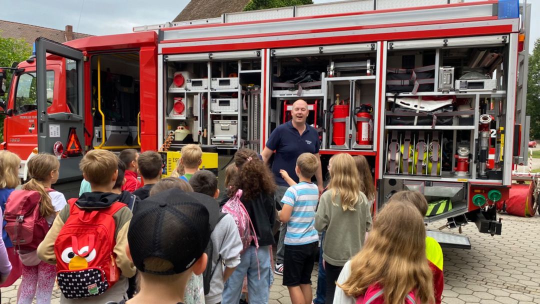 So begrüßten wir unter anderem die 3. Klasse der Grundschule Regelsbach, welche im Rahmen ihres Lehrplanes das Thema "Feuerwehr" behandelten. Unsere Kammeraden führten die beiden Klassen durch das Gerätehaus und erklärten den begeisterten Kindern die Fahrzeuge. Zuletzt standen wir für alle Fragen der Schüler Rede und Antwort.