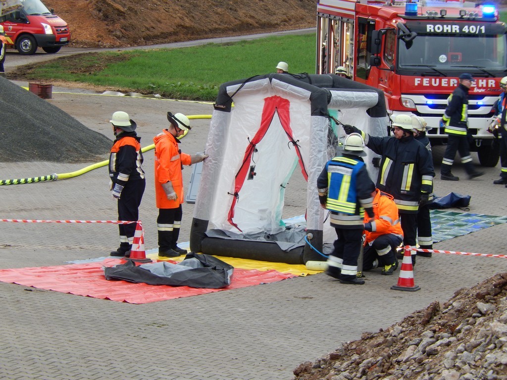 Kreisbrandmeister Thomas Richter nahm die Anregung von Herbert Betz und Klaus Dechet auf und arbeitete für den 22. Oktober eine Großübung auf dem riesigen Gelände der Biogasanlage bei Prünst aus. So warteten 11 Kommandanten kurz vor 16:00 Uhr auf den Funkspruch um mit ihren Kameradinnen und Kameraden auszurücken. Retten von Verletzten, Aufbau einer Dekontaminationsstrecke, Vermisstensuche in den Wäldern, Auslegen von fast 2000 Metern Druckschläuchen, Aufbau von Löschbecken, Löschangriffe mit drei Strahlrohren um Gasaustritte einzudämmen, Einheiten von Atemschutzträger müssen in rauchende Gebäude vordringen, Streckenposten sichern den Einsatz ab und die Einsatzführungsstelle koordiniert und dokumentiert. Über 150 Feuerwehrkameradinnen und Kameraden sind im Einsatz. Hier die Gesamtlogistik und Einsatzabläufe im Griff zu haben ist eine enorme Herausforderung.
