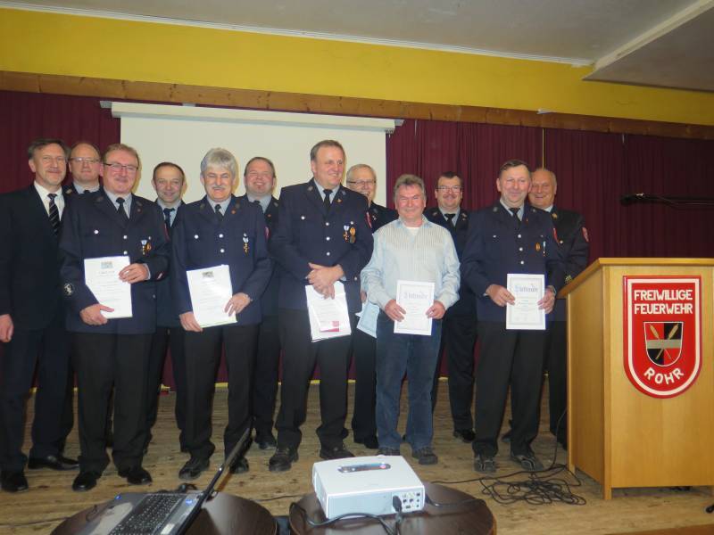 Marc Bär, Siegfried Hindera, Luisa Hummel, Ramona Hummel und Tobias Ponwitz wurden zu Feuerwehrmännern/-frauen befördert. Für langjährige Treue zum Verein wurden Jens Baumeister, Ralf Deindörfer, Marco Gehring, Klaus Reinert, Richard Schwarz (alle 25 Jahre), Reiner Braun, Robert Ergler, Herbert Richter, Gerhard Tischner, Günter Ziegler, Georg Zimmermann (alle 40 Jahre), Erwin Dürr, Leonhardt Schmidt und Michael Schwab (alle 50 Jahre) ausgezeichnet. Robert Ergler, Herbert Richter, Gerhard Tischner und Günter Ziegler leisten seit 40 Jahren aktiven Feuerwehrdienst. Zusammen mit stellvertretenden Bürgermeister Klaus Popp und Kreisbrandinspektor Richard Götz nahmen die Rohrer Feuerwehrführungskräfte die Ehrungen vor.
